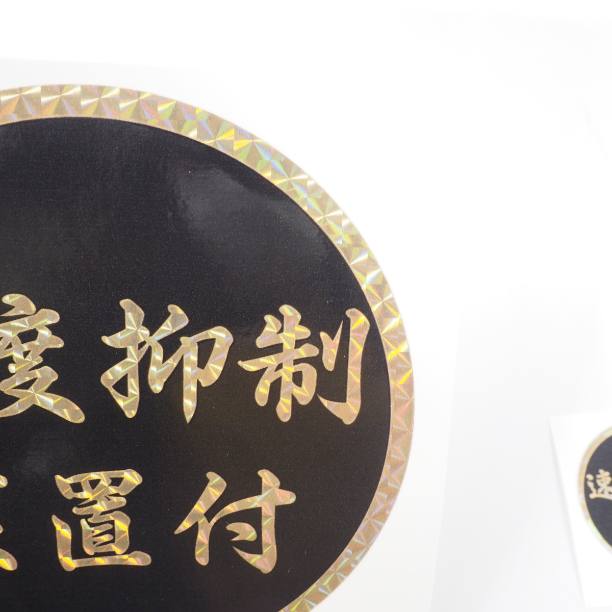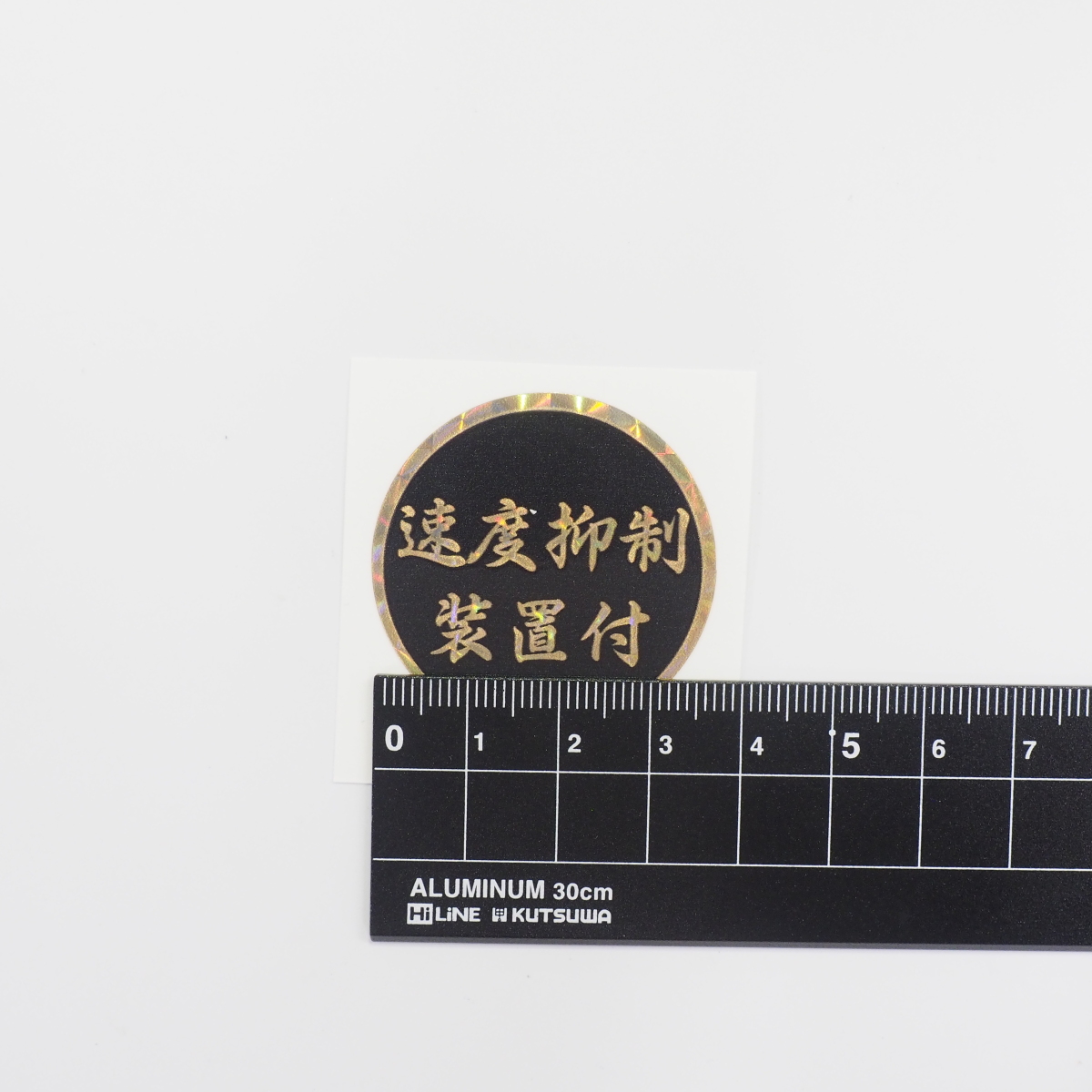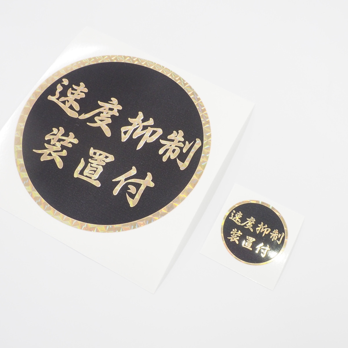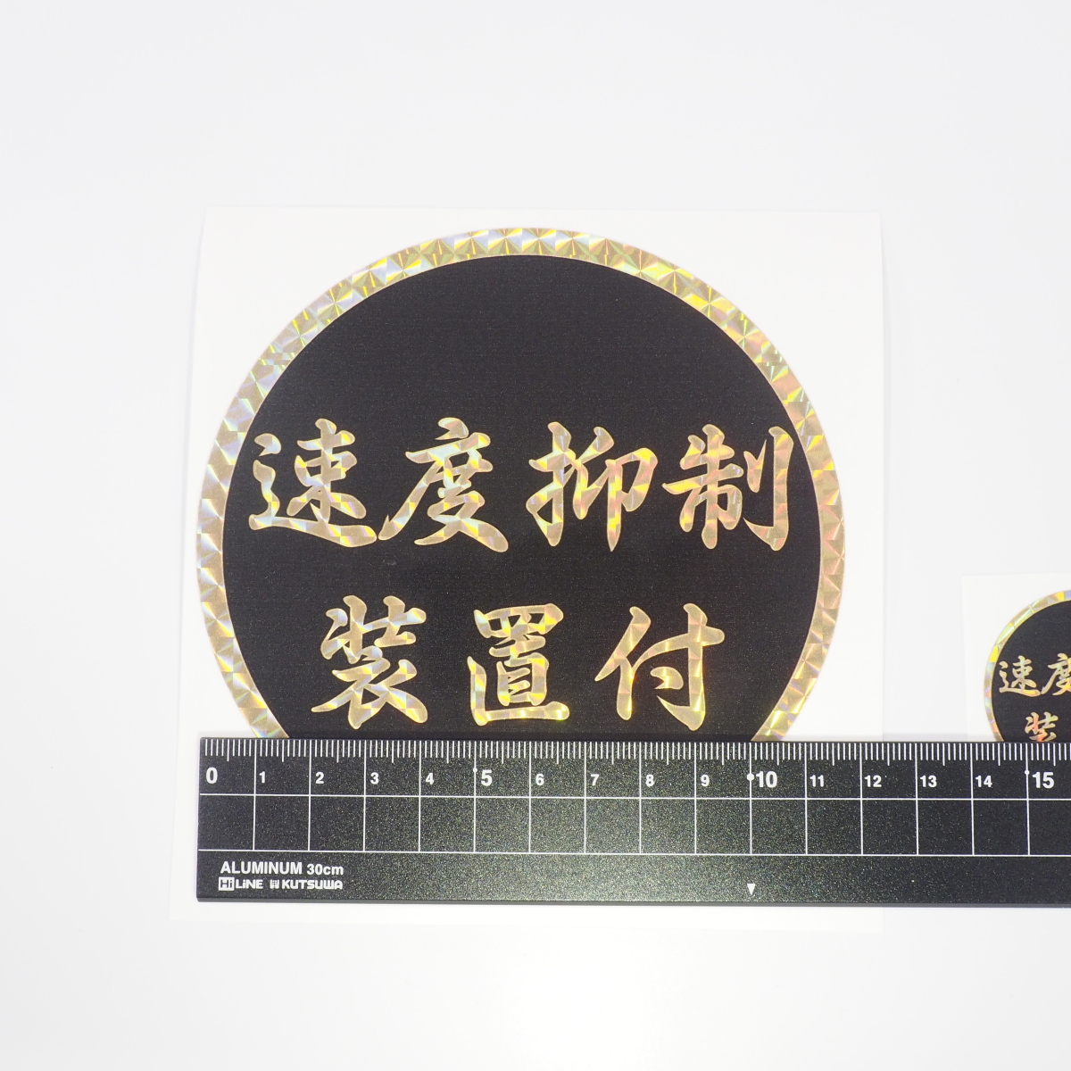 「速度抑制装置付」ステッカー 2枚セット 12cm 3.8cm キラキラホログラム ゴールド デコトラ ダンプ 大型車 デカール 速度抑制 シール