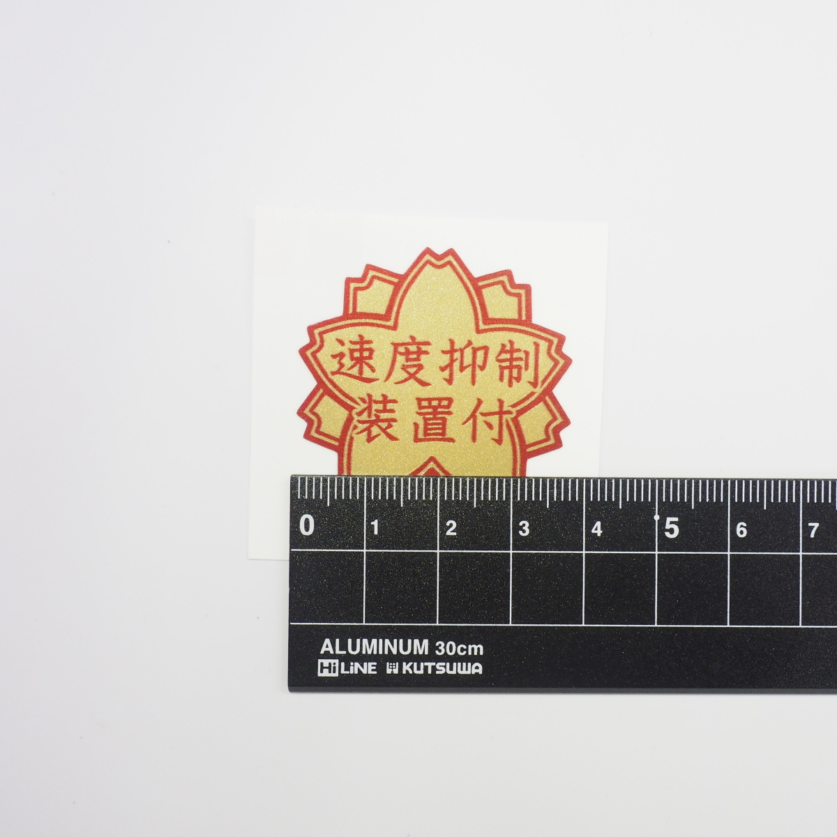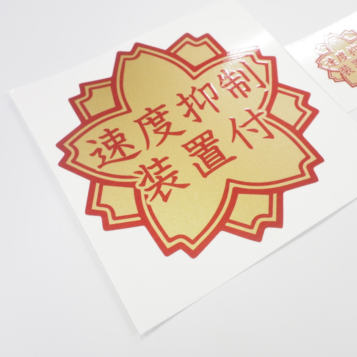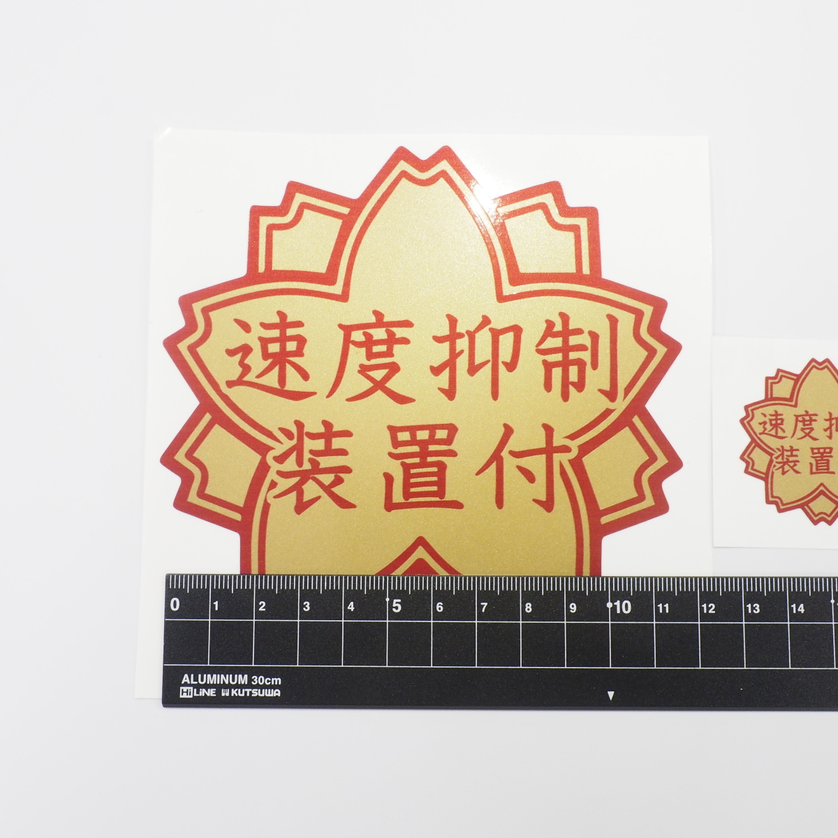「速度抑制装置付」ステッカー 2枚セット 12cm 3.8cm 桜 金ベース赤文字 デコトラ ダンプ 大型車 ギガ スーパーグレート プロフィア