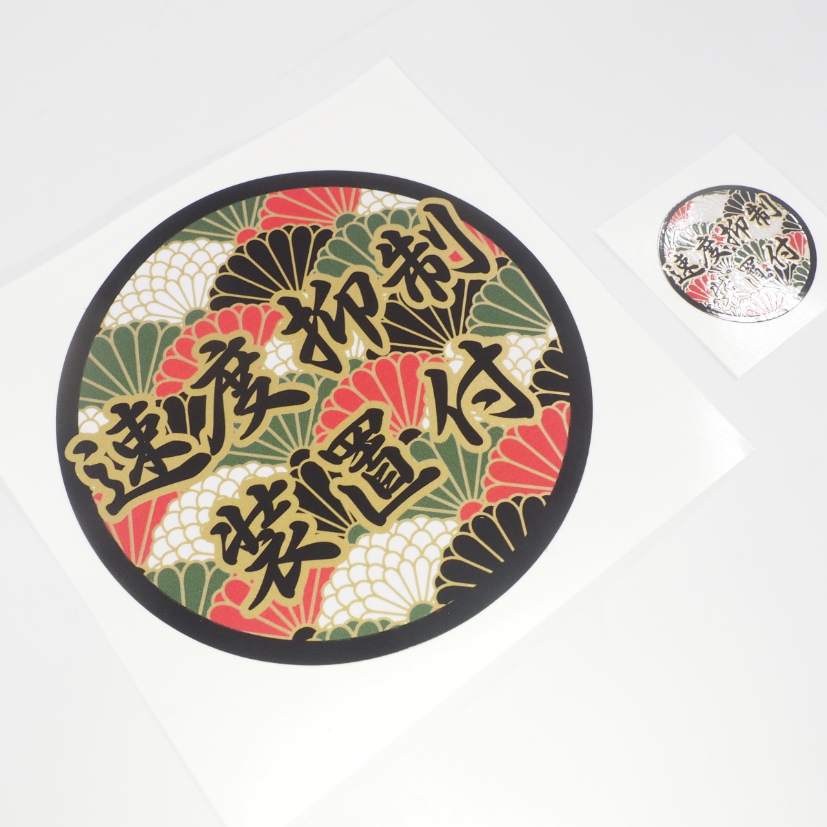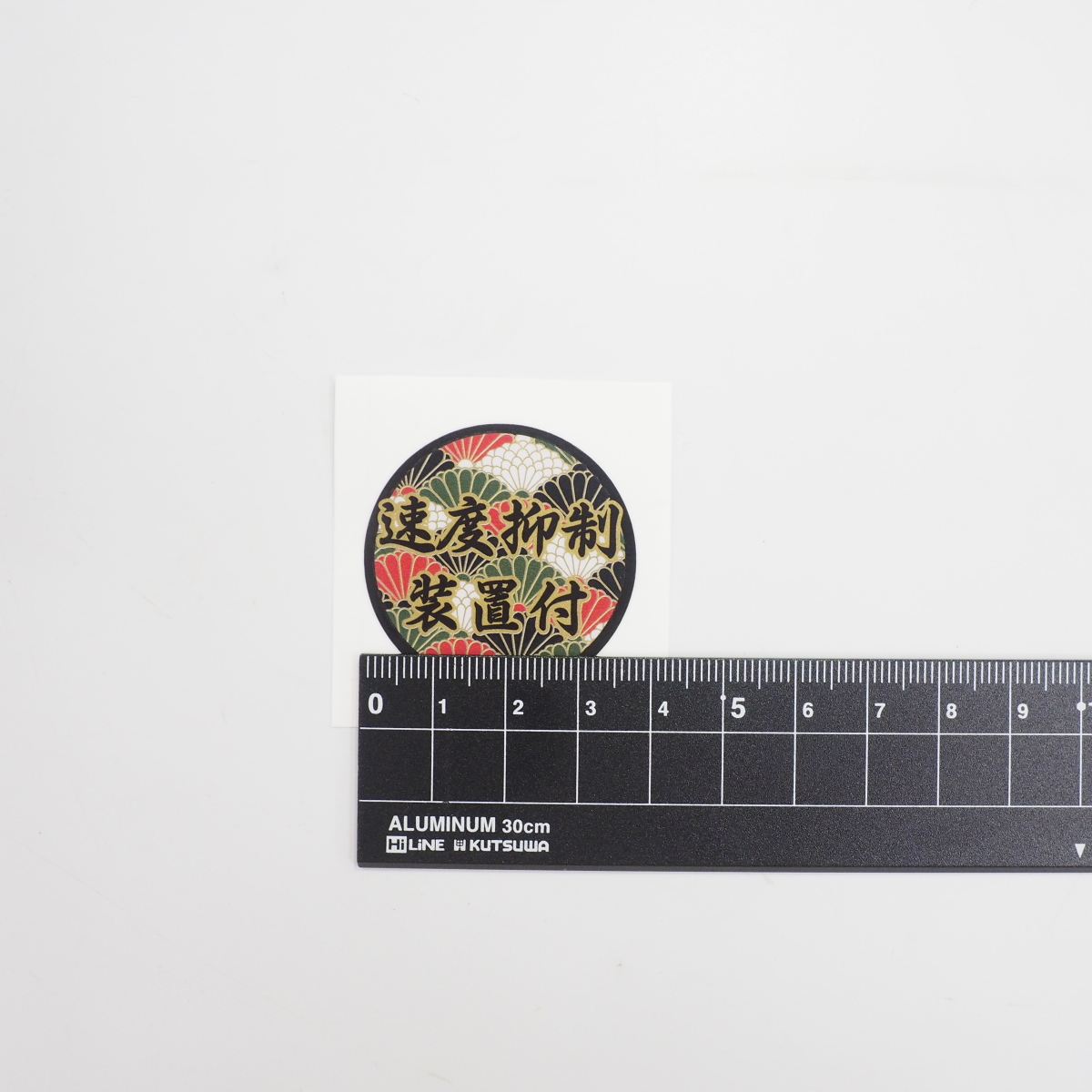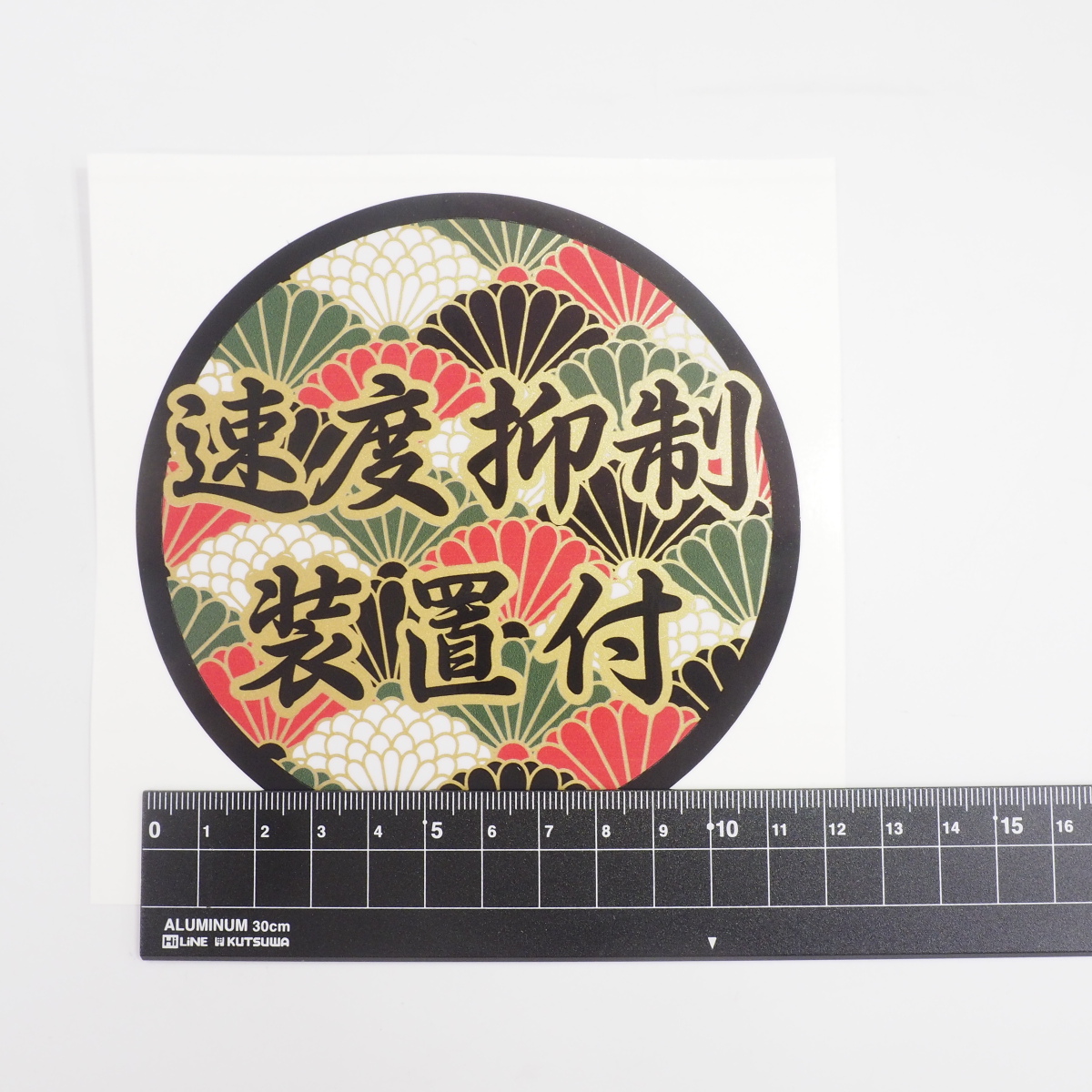 「速度抑制装置付」和柄 菊 ステッカー 2枚セット 黒文字 12cm 3.8cm ゴールド デコトラ ダンプ 大型車 デカール 速度抑制 シール 車検