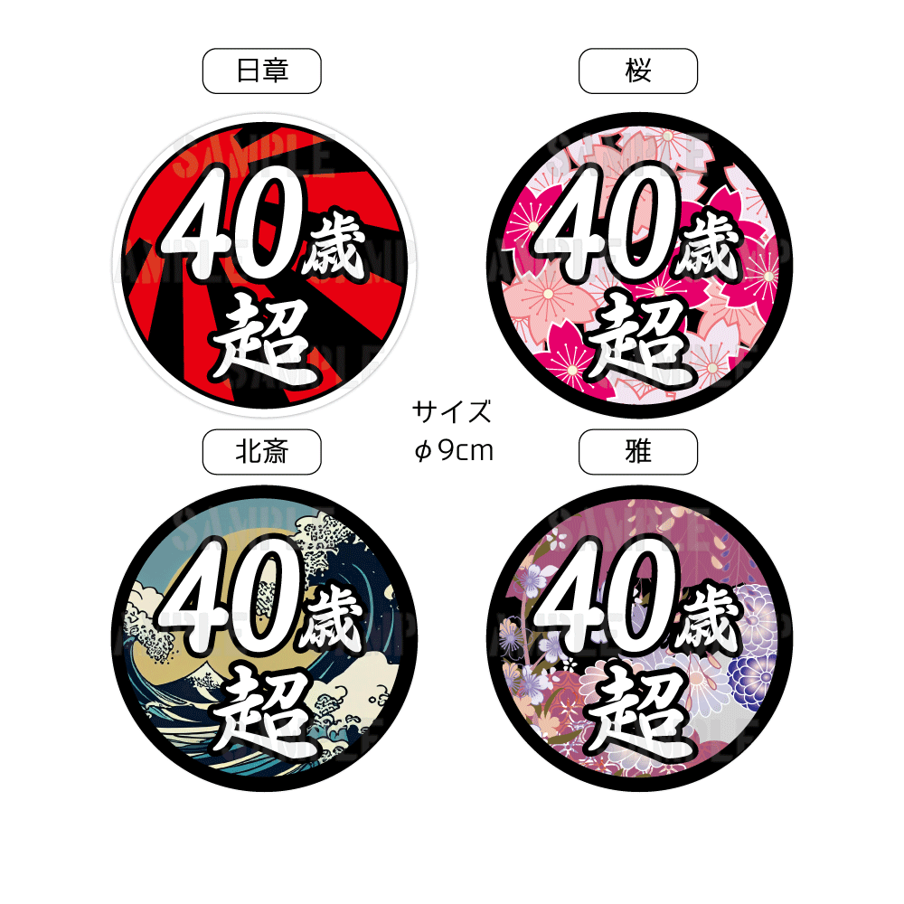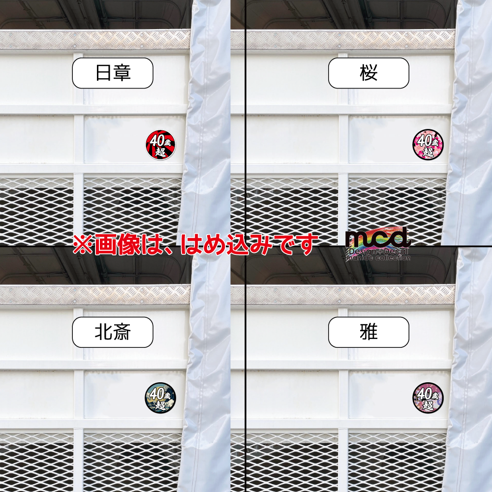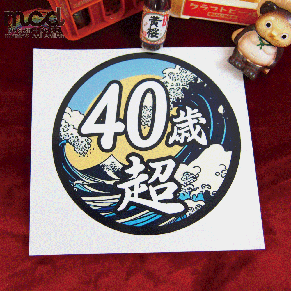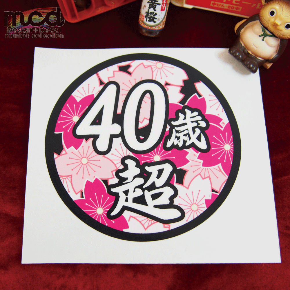 面白ステッカー 40歳超え 9cm丸 ネタ おもしろ パロディ ギャグ ユニーク デコトラ ダンプ 積車 トラック 20トン 大型 トラック ワンポイント 丸型 新規格車 おじさん おっさん アラカン 40代 特車 和柄 日章 花 粋 カラフル 華 桜 かっこいい