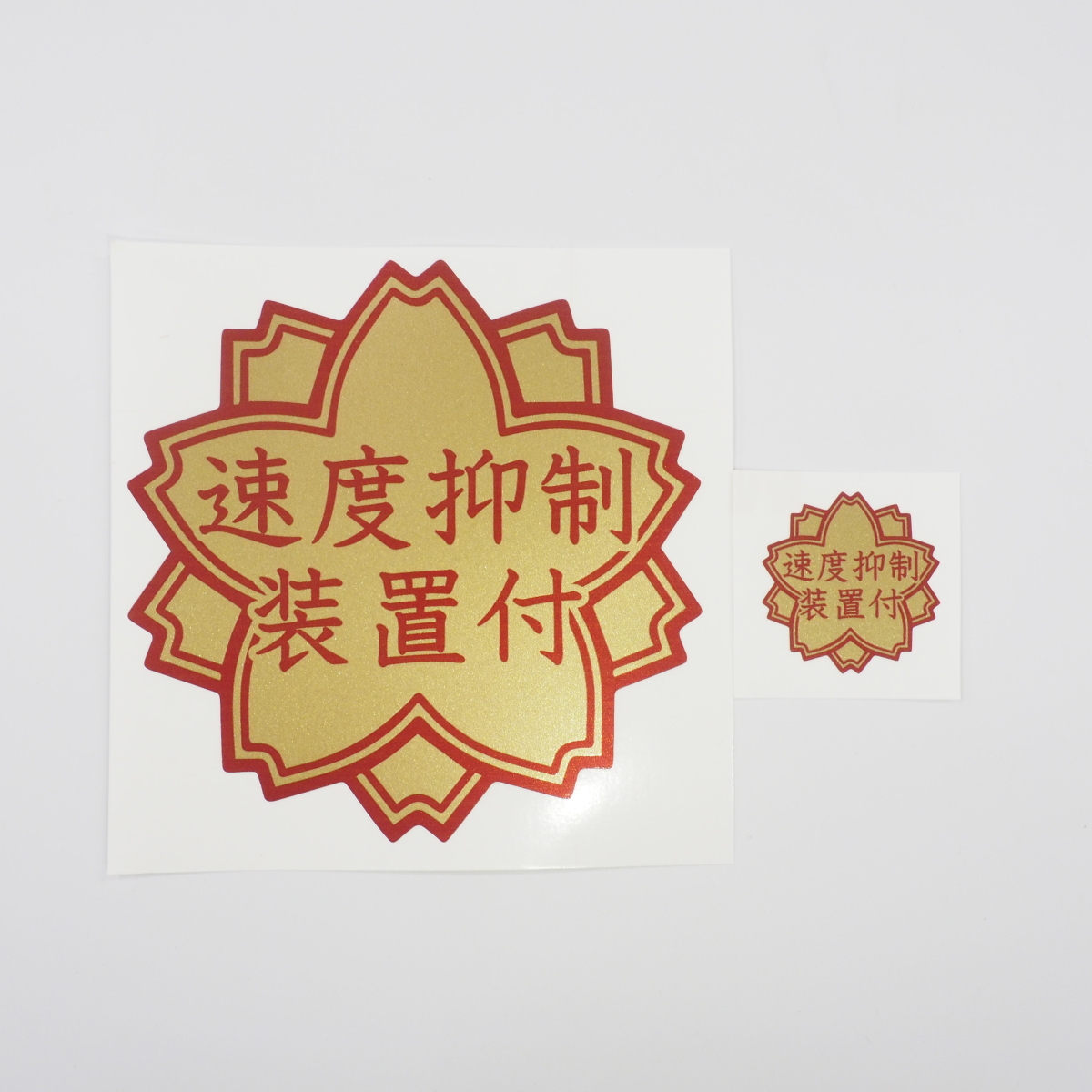 「速度抑制装置付」ステッカー 2枚セット 12cm 3.8cm 桜 金ベース赤文字 デコトラ ダンプ 大型車 ギガ スーパーグレート プロフィア